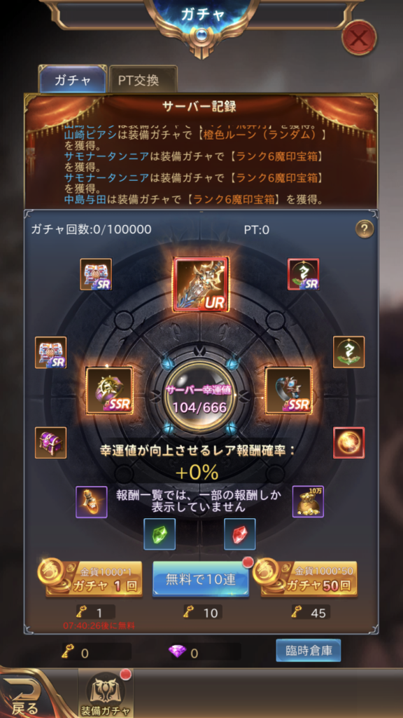 これは同じサーバーで遊んでいるプレイヤーの誰かがガチャを引く度に「幸福度」が貯まっていき、それに伴ってガチャから排出されるレアアイテムの確率が上昇するといったものです。誰かがレアアイテムを当てるまでどんどん上昇していきますので、引くタイミングをよく考えて引くことをお勧めします。