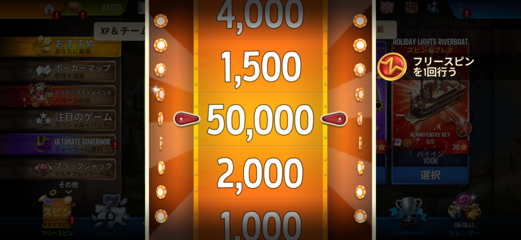 - 3時間に1回挑戦できるフリースピンを回すことによって、無料で大量のチップが貰えます。回した回数が累計5回に達するとジャックポットスピンが発動してさらに高額のチップが貰えますので、忘れずに回しましょう!