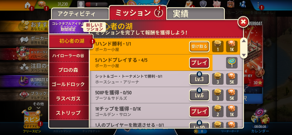 ゲーム序盤で多くのチップを集めたい場合は、ミッションをクリアしていくのが有効です。指定されたミッションをクリアすることによって、ゴールドやチップなどがプレゼントとして貰えます。最初は「初心者の湖」と呼ばれるミッションがありますので、そちらを上から順番にクリアしていくのがおススメです。