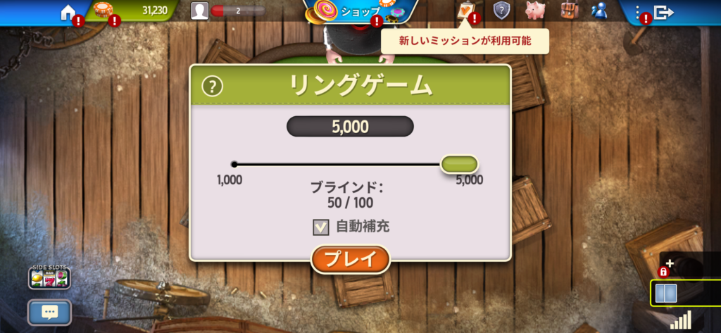 ゲームをプレイする際は賭けるレートを事前に設定できますので、序盤は100~1000の低いレートで勝負してコツコツ増やしていきましょう。